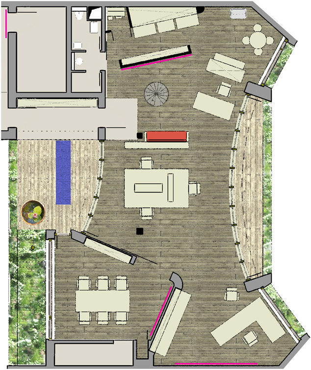 Dachgeschossausbau zu Wohnungszwecken trotz der Beschränkungen des Förderprogramms Präsenz und Blickfang am Oranienplatz mittels offener Glasfront und Säulenstruktur